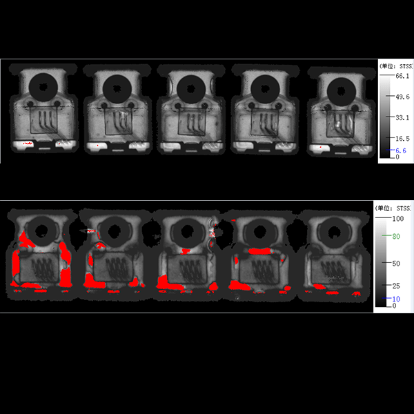 塑封 IC 器件的检测,红色区域为分层缺陷,采用相位翻转检测后对缺陷位置着色,并计算出缺陷所占百分比