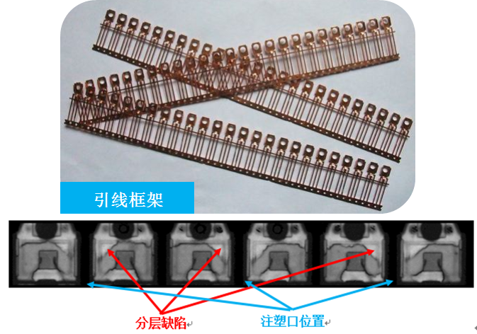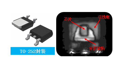 塑料封装与引线框架分层(脱粘)是封装制造过程中常见的缺陷类型。该缺陷的存在,造成塑封无法有效保护芯片工作,水汽容易侵入,严重影响器件的寿命和可靠性。只有使用超声检测方法,才能有效检查该缺陷是否存在。